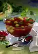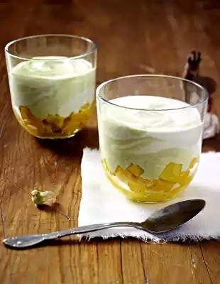 Divide the mango with lime juice into four dessert glasses. Pour white and green cream alternately into the piping bag with a tablespoon. Cut off the tip so that the hole is about 1 cm Ø. Spray the cream onto the mango and spread the surface loosely with a spoon