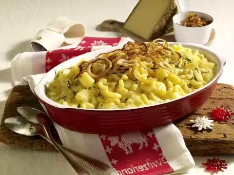 Grate cheese. Bring cream and milk to the boil. Melt 2/3 cheese in it while stirring. Season sauce with salt, pepper and nutmeg. Drain potatoes and noodles.