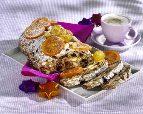 Shape into a loaf (approx. 30 cm long) and place on a baking tray lined with baking paper. Cover and leave to rise again in a warm place for approx. 30 minutes. Bake in the preheated oven (electric cooker: 175 °C/ convection oven: 150 °C/ gas: level 2) for 60-70 minutes. Cover after half the baking time. Take out of the oven, place on a rack and let it cool down. Dust with icing sugar and serve decorated with candied orange slices, candied figs and almonds