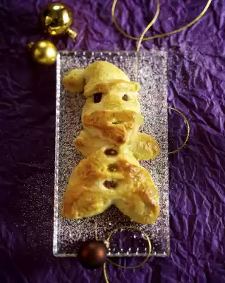 Divide the dough into 8 equal pieces. From each piece form 1 ball for the head, 1 roll for the body, 1 cap and 1 beard. For the feet, cut rolls once at the bottom, for the arms cut above the body on the right and left. Fold everything on 2 baking trays lined with baking paper to form Santa Clauses. Press raisins into the heads as eyes and into the body as buttons. Spread the Santa Clauses with egg yolk. Bake in the preheated oven (electric cooker: 200 °C/ convection oven: 175 °C/ gas: level 3) for 20-25 minutes, remove from oven and allow to cool
