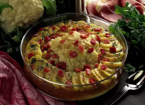 Wash the potatoes and cook for 20 minutes. Drain, let cool a little, peel and cut into slices. Clean and wash the cauliflower and cook in a little salted water for 15 minutes. Grease a large, flat casserole dish.
