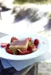 Washing and cleaning strawberries. Puree 250 g strawberries and cut the rest very finely. Whip the cream until stiff, adding vanilla sugar. Fold in the strawberry pieces and fold in the strawberry puree in streaks.