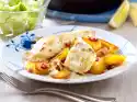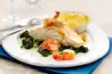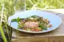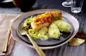 Cut the remaining salad into fine strips. Boil up the white sauce and stir in the salad strips. Immediately arrange the potato snow with salad heart cream on the salmon and serve.