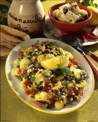Wash the potatoes and cook in boiling water for about 20 minutes. In the meantime, put Bulgur in 100 ml cold water and let it swell for about 30 minutes. Peel onion and garlic. Cut onion into slices, garlic into slices. Wash the thyme, dab dry and remove the leaves from the stalks. Wash the chilli pepper and cut lengthwise. Cut the sheep's cheese roughly into cubes and put it in a bowl with the thyme, garlic, onion, chilli and olives. Pour olive oil, up to 4 tablespoons, over it and let it draw through. Clean, wash, halve and seed the tomatoes. Finely dice tomato halves. Wash parsley, dab dry and cut into fine strips, except for one leaf for garnishing. Crush them together in a mortar. Drain the potatoes, rinse with cold water and peel. Cut the potatoes into slices. Mix drained bulgur, tomato cubes, parsley, coriander, lemon juice and remaining oil. Season with salt and pepper and fold into the potato slices. Allow to soak for a short time, season again with salt and pepper and arrange on a plate. Serve garnished with parsley and lemon wedges. Serve with feta cheese and flat bread