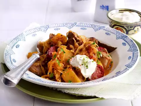 Add sauerkraut and potatoes to the goulash and braise for another 30 minutes. Season to taste with salt, pepper and sugar. Cut Cabanossi into diagonal slices. Heat the oil in a pan and fry the cabanossi over medium heat.
