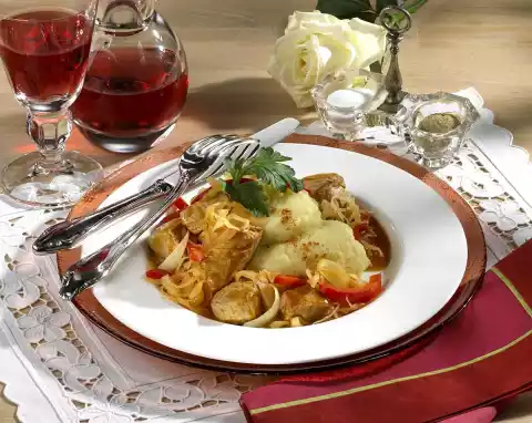 Add the sauerkraut and peppers to the pot and braise for another 30 minutes. Wash, peel and chop the potatoes. Cook potatoes in salted water for about 20 minutes. Drain potatoes. Add milk and fat and mash to a puree.