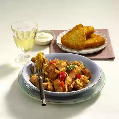 Add both to the goulash. Add some more stock as needed, so that the ingredients are covered. Cover and stew for about 15 minutes. Season to taste. Arrange the goulash on plates. Put a blob of sour cream on each plate and dust with paprika. Potato rösti taste good with it.
