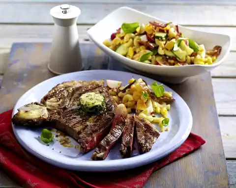 Mix pasta, corn, eggs, radishes, cucumber, bacon and dressing. Take out the meat and let it rest for a short time in aluminium foil. Season meat with pepper and cut into slices. Arrange salad and meat on plates.