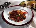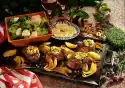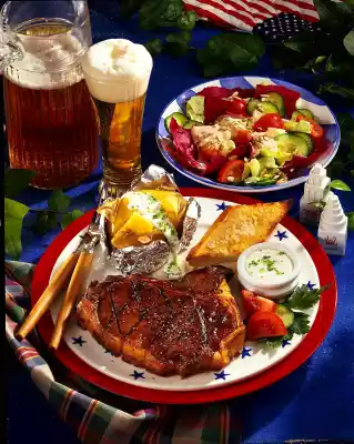 Cut baguette in half lengthwise and cut diagonally into pieces. Spread with garlic butter and place in the oven with the potatoes about 8 minutes before the end of the baking time. Wash the steaks and dab dry. Heat the oil in 2 pans (or grill them on a grill) and fry the steaks for about 8 minutes, turning them over. Season with salt and steak pepper and arrange on plates together with the baked potatoes, sour cream and garlic bread. Garnish with parsley and remaining tomatoes and cucumber and serve sprinkled with chives. Serve salad extra