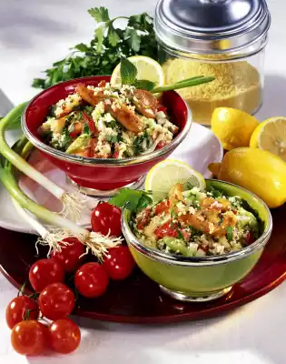 Clean, wash and chop the tomatoes. Wash, peel and finely dice the cucumber. Wash parsley and mint, dab dry and cut into strips. Mix couscous, spring onions, cucumber, herbs and tomatoes well in a bowl. Add vinaigrette and mix well. Leave to stand for about 30 minutes. Meanwhile wash the meat, dab dry and cut into strips. Heat the oil in a pan and fry the meat for about 2 minutes while turning. Then season with salt, pepper and paprika. Season tabbouleh with salt and pepper again. Fill into small bowls, place the meat on top and serve garnished with lemon slices, parsley and mint as desired