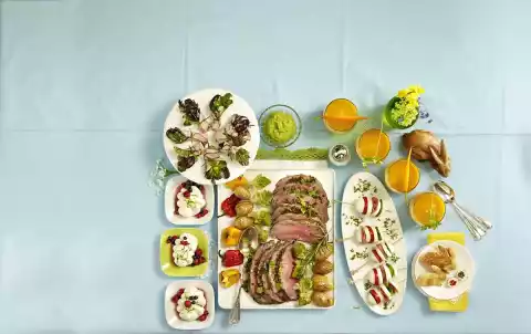 Cut the eggs into 4 slices. Put the prepared ingredients alternately on skewers so that the egg shape is recognizable. Season vinegar with salt, pepper and sugar. Mix with oil and sprinkle the egg skewers. Garnish with cress