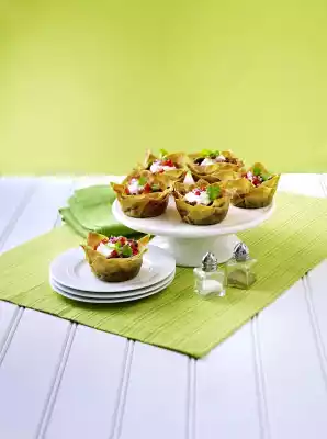 Remove Wan Tan leaves from the freezer about 5 minutes before use. Grease the recesses of a muffin tray (12 recesses). Place 2 Wan Tan sheets on top of each other. Line the recesses with them.