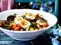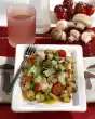 Wash, clean, halve, seed and dice the tomatoes. Leek onion clean, wash and cut into fine rings. Peel onion and cut into rings as well. Arrange salad on a plate, sprinkle with cheese, tomatoes, spring onion, onion rings and olives.