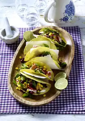 For the vinaigrette, clean and wash the chilli and cut into fine rings. Mix lime juice, vinegar, chilli, sugar, salt and pepper. Embezzle oil. Mix corn with kidney beans, rocket, spring onions, turkey breast and vinaigrette
