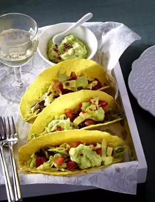 3 Preheat the oven to 180 °C (th 6). Put the tortillas in the oven and cook them for 3 minutes. Divide the meat mixture, salad, avocado sauce and diced tomatoes in the centre. Fold the tacos in half and serve.