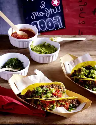 Wash the coriander, shake dry and chop the upper 1/3 of the stems finely. Dice meat and onions very finely or chop them finely. Season to taste with salt, pepper and cumin. Spread the meat over the tacos.