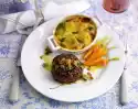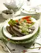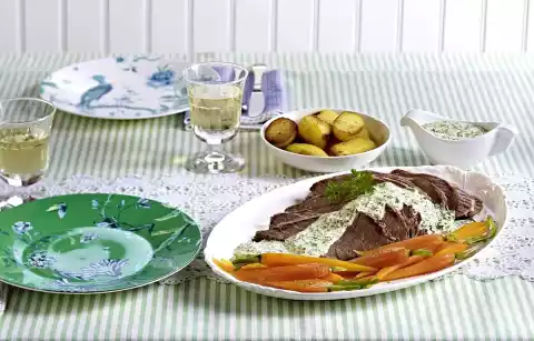 Cut the meat into slices. Arrange carrots, meat and sauce. Garnish with herbs. Add potatoes. Use broth for other purposes