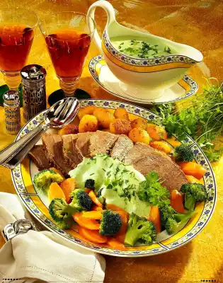 Turn from time to time. Remove the meat, dab dry and store the marinade. Rub the meat with salt and pepper. Heat 2 tablespoons of oil in a roaster. Brown the meat in it. Deglaze with marinade, add stock. Cover and simmer at low heat for about 2 1/2 hours. In the meantime, wash the potatoes and cook in little boiling water for about 15 minutes. Drain potatoes, rinse and peel. Clean broccoli, divide into florets and wash. Peel, wash and slice the rest of the carrots. Steam vegetables in boiling salted water for about 10 minutes. Wash herbs, dab dry. Cut chives into small rolls. Puree parsley and chervil, except for a little bit for garnishing, with 2/3 of the chives and sour cream.