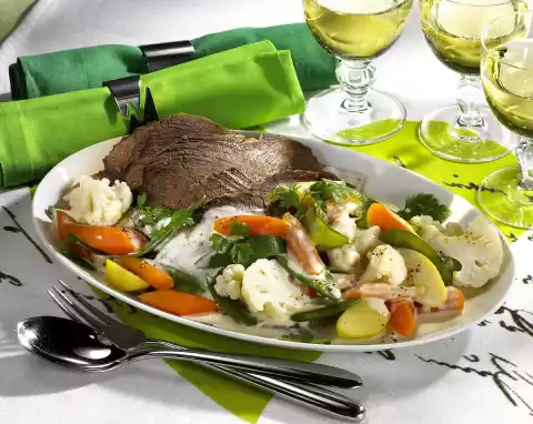 Store vegetable water. Melt the fat. Sweat flour in it. Deglaze with 200 ml vegetable water, 200 ml meat stock and cream. Boil up while stirring constantly. Season to taste with salt, pepper, horseradish and lemon juice.