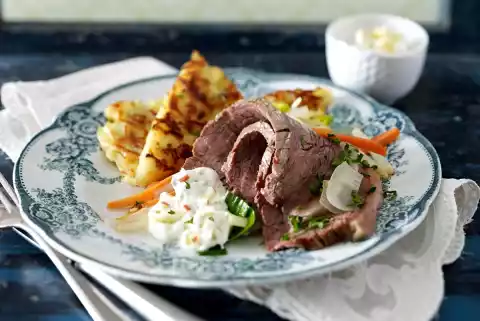 Wash parsley, shake dry and chop finely. Lift out the boiled beef. Serve with vegetables, some stock, apple salsa and rösti. Sprinkle with parsley.