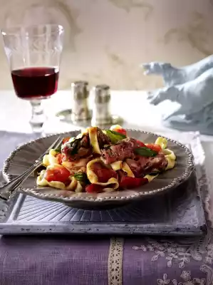 Deglaze tomato mixture with wine and pasta water, bring to the boil and simmer for about 3 minutes. Season with salt and pepper and mix into the pasta. Arrange noodles with the pancetta rolls and garnish with fried sage leaves.