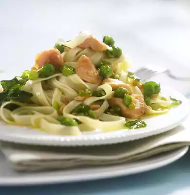 Mix the noodles in a pot or immediately in a large serving bowl with the salmon-peas sauce. Season again with salt, pepper and sugar if necessary.