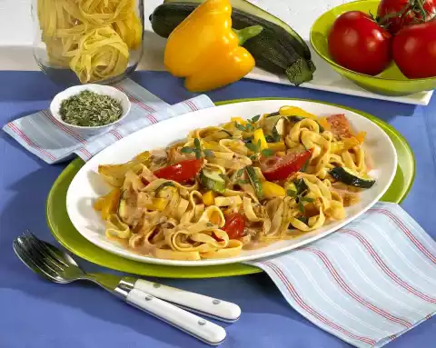 Add the zucchini, peppers and tomatoes and fry briefly. Deglaze with vegetable stock and bring to the boil. Stir in cream cheese and tomato paste and cook over medium heat for about 5 minutes. Season with salt, pepper and herbs.