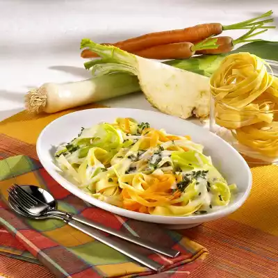 Peel and wash the carrots and peel long thin strips with a peeler. Clean, wash and cut the leek into long thin strips. Peel, wash and cut celery into fine sticks