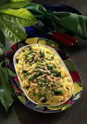 For the sauce, clean and wash the broccoli and cut it into very small florets. Blanch in boiling salted water for 2 minutes, then drain. Peel and finely dice the onion. Dice ham as well, wash chives and cut into small rolls. Cook the pasta in plenty of boiling salted water for 8 - 10 minutes. In the meantime melt the fat. Sauté the onions in it. Add broccoli, peas and ham. Fill up with cream and stock. Bring to the boil briefly. Mix the egg yolks with some sauce and stir back into the sauce. Do not let it boil any more. Sprinkle with chives. Season to taste with salt, pepper and nutmeg. Arrange noodles and sauce together