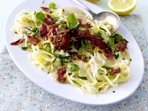 Finely mash the beans with a hand blender. Season with salt, pepper and 1 pinch of sugar. Crumble the bacon roughly. Drain the noodles. Arrange noodles with bean sauce, herbs and bacon. Drizzle with lemon oil.