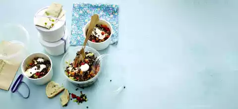 Fold down 6 tbsp. of oil. Season to taste with salt, pepper and sugar. Pour the dressing over the lentils and mix well. Season salad again with salt, pepper and vinegar. Arrange the salad or fill it into Tupper tins, cover with horseradish cream - and off you go!