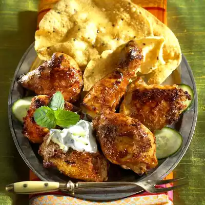 Place the meat and marinade on a baking tray lined with baking paper. Drizzle with oil. Bake in a hot oven (electric cooker: 200 °C/circulating air: 175 °C/gas: level 3) for approx. 45 minutes. Continue baking under the grill or on the highest setting for approx. 5 minutes. Serve with cucumber raita. Served with: Pappadum (Indian flat bread)