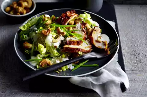 Remove meat from the oven and let it rest for a short time. Coarsely chop the cashew nuts if necessary. Divide the romaine lettuce between two plates. Cut the meat into slices. Arrange the meat, snow peas and cashews on the salad and drizzle with the yoghurt sauce.