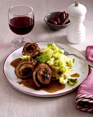 Cut roulades in half, serve with sauce and mashed potatoes and Brussels sprouts.