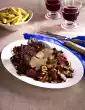 In the meantime, stir the starch and 4 tablespoons of water until smooth. Lift the roulades out of the stock. Stir the starch into the boiling stock, bring to the boil and simmer for about 1 minute. Season to taste with salt, pepper and icing sugar.