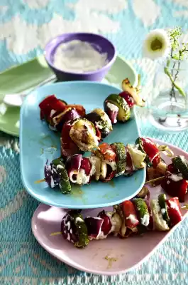 Place the grill trays on the preheated grill. Grill the skewers for about 10 minutes while turning. Brush the skewers with the dip 3-4 minutes before the end of the cooking time. Add the rest of the dip