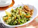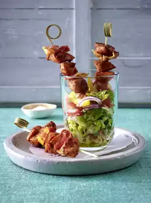 Cut the bacon slices into 4-5 pieces each. Put them alternately on skewers with the meat. Heat 1 tablespoon of oil in a frying pan. Fry the skewers for 6-8 minutes. Arrange the salad in glasses as desired.