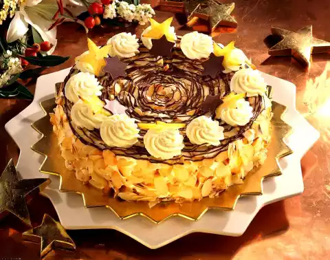 Whip 325 g cream until stiff, pouring in 2 teaspoons of sugar. Spread the cake with 2/3 cream, sprinkle with almonds. Heat the rest of the chocolate coating again and put it into a freezer bag. Cut off a small corner. Decorate the cake with chocolate stripes. Cut out small stars from the chocolate plate. Decorate the cake with the rest of cream, carambola and stars