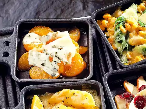 Drain the mandarins and cut the cheese into slices. Put some tangerines in a raclette pan. Place a slice of cheese on top and gratinate under the raclette grill