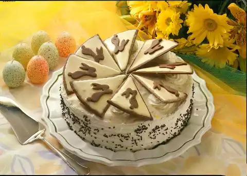 Colour yellow with some food colouring and spread it on the triangles. For the bunnies, knead marzipan, remaining icing sugar and cocoa, roll out flat, cut out 8 bunnies and place them on the icing.