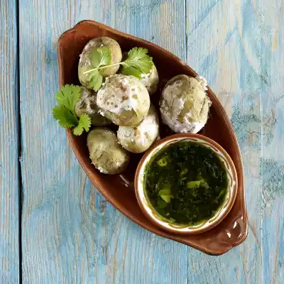Season to taste with salt and pepper. Arrange Mojo Verde in a bowl. Arrange the potatoes on a plate and garnish with the remaining herbs.