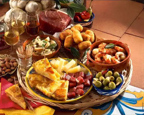 First turn in 1 whisked egg, then in breadcrumbs. Fry in 1/2 l oil. Peel and chop 1 garlic clove. Boil up with 1/8 l oil, lemon juice, peppercorns, 1 bay leaf, thyme, 1/2 teaspoon salt and 1/8 l water. Simmer for about 20 minutes. Clean, wash and cut the mushrooms into thick slices. Bring the mushrooms to the boil in the stock, cool. Peel 2 cloves of garlic, cut into slices. Remove seeds from chillies, wash and chop. Remove the shrimps from their shells, remove the intestines, wash and dab dry. Fry in 2 tablespoons of oil with 1 bay leaf for about 5 minutes. Fry chilli and garlic briefly, season.