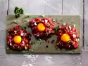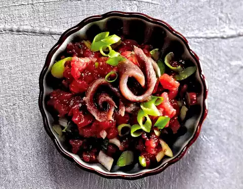 Wash the meat, dab dry, dice, then chop finely. Season with salt, pepper and Tabasco. Serve the tartar with spring onions, diced anchovies, anchovy rolls and egg yolks.