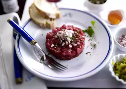 Fill the tartar into the rings and press it in. Remove aluminium foil from the tartar. Serve the tartar with the side dishes. So everybody can refine and season it himself. Baguette tastes good with it.