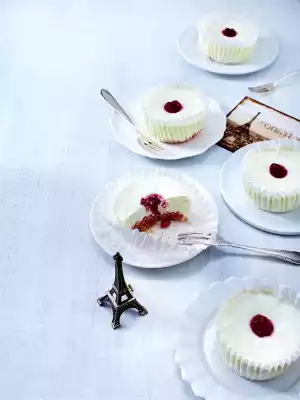 Place the remaining paper cups with the sponge cake base in the muffin tray, fill with the rest of the quark mixture and raspberries and bake at the same temperature.