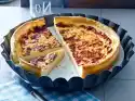 Whisk the crème fraîche, milk and 4 eggs. Season with salt and pepper. Spread the onions on the dough, sprinkle with bacon. Pour egg icing over it. Bake in a hot oven at the same temperature for 30-40 minutes.