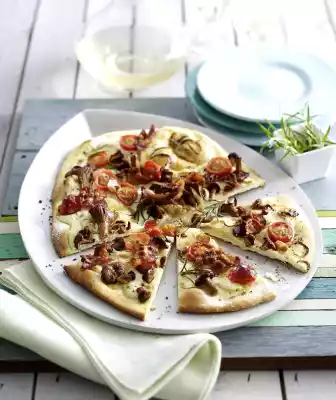 Put the dough in. Spread a quarter of the sour cream on the dough. Spread a quarter of the mushrooms, tomatoes, shallots and rosemary evenly on top. Bake in the preheated oven (electric range: 250 °C/ convection oven: 225 °C/ gas: level 5) on the bottom shelf for 10-12 minutes.