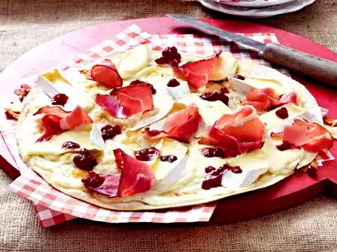 Spread slices of ham and cranberries on the two tarte flambée and serve.
