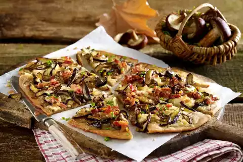 Cut the dough in half, knead and roll out into oval flat cakes (approx. 20 x 30 cm each). Place on two baking trays lined with baking paper. Spread half sour cream on each and spread half of the mushroom mixture on top. Bake one after the other in a hot oven (electric cooker: 200 °C/circulating air: 175 °C/gas: see manufacturer) for about 15 minutes. Wash the chives, shake dry, cut into fine rolls and sprinkle over the tarte flambée.
