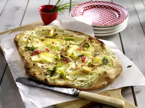 Cover the dough and let it rise in a warm place for about 30 minutes. Wash the herbs, dab dry and pluck the leaves from the stems. Chop herbs finely and mix with sour cream. Season with salt. Wash the potatoes thoroughly, cut them into thin slices and cook them in boiling salted water for 4-5 minutes.